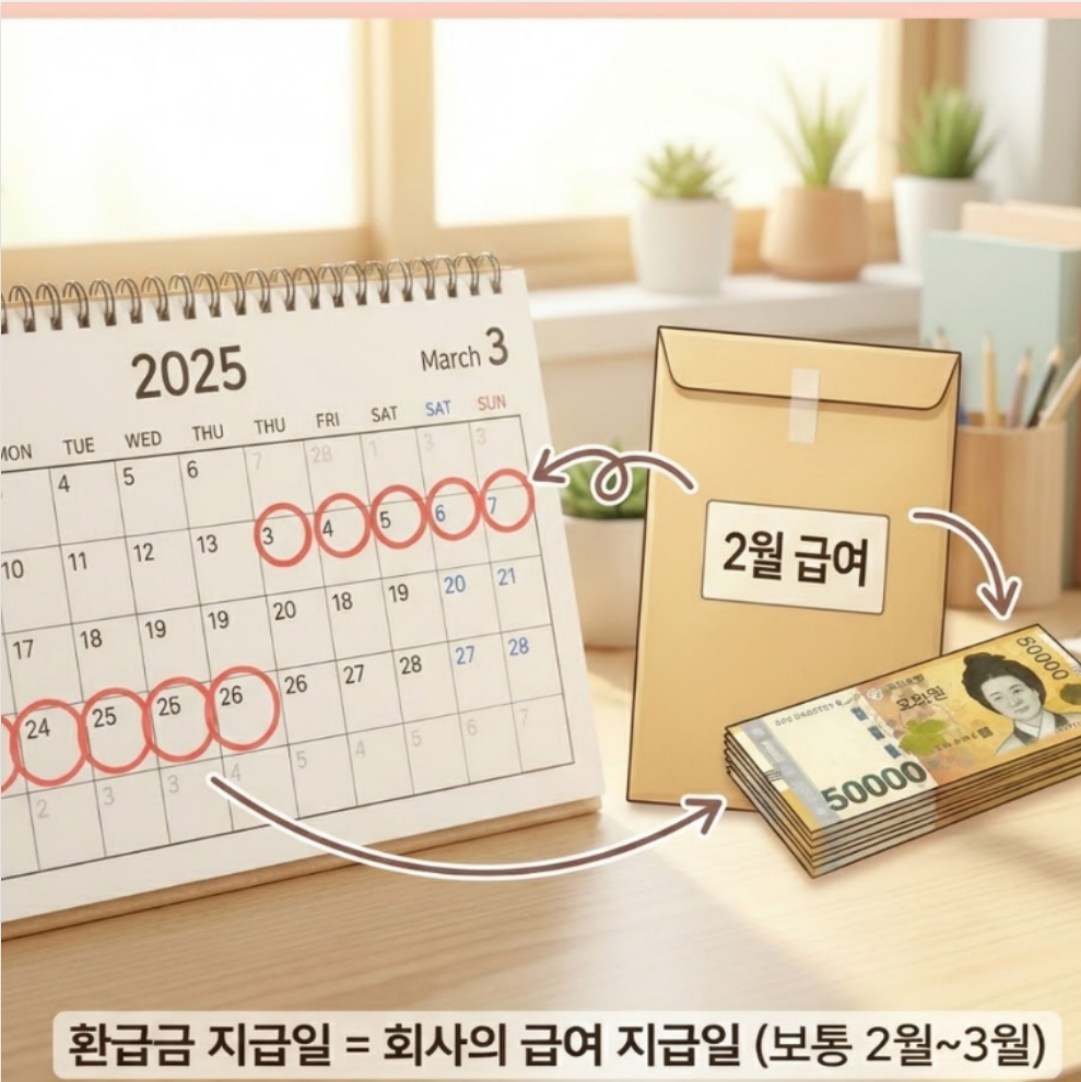 연말정산 환급금은 개인이 국세청에서 직접 받는 것이 아니라, 국세청이 회사로 지급하면 회사가 다시 직원에게 급여와 함께 지급하는 구조입니다. 따라서 가장 정확한 지급일은 회사의 '급여 지급일'과 연동됩니다.