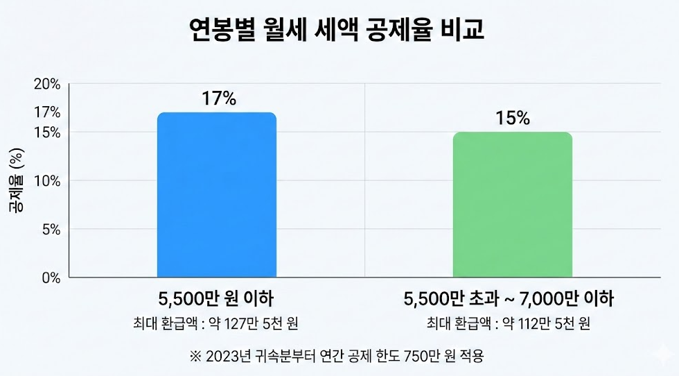 소득이 적을수록 더 많은 비율을 돌려줍니다. 2023년 귀속분부터 공제 한도가 연간 750만 원으로 상향 조정되어 혜택이 더욱 커졌습니다.